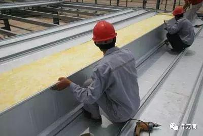 7.5、安裝屋面彩鋼板,拆去屋檐處的專(zhuān)用夾具,用預留的20厘米貼面為玻璃棉收邊。