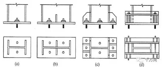 門(mén)式剛架輕型房屋鋼結構的柱腳宜采用平板式鉸接柱腳(圖a、b)。當有必要時(shí),也可采用剛性柱腳(圖c、d)。