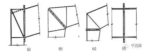 門(mén)式剛架橫梁與柱的連接,可采用端板豎放(圖a) 、端板斜放(圖b) 和端板平放(圖c) 。橫梁拼接時(shí)宜使端板與構件外緣垂直(圖d)。