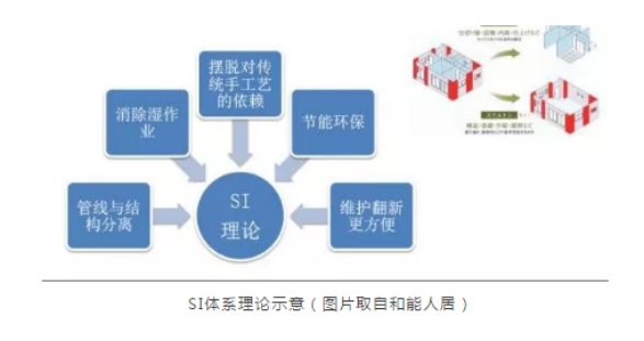 1、SI理論的體系基礎。S就是支撐體(Skeleton)——建筑主體結構;I就是填充物(Infill),包括除了主體結構外建筑裝飾材料、機電設備、管線(xiàn)等。裝配式裝修就是要做到支撐體與填充物的分離,一般主要是指管線(xiàn)與結構體分離、裝修與結構體分離。
