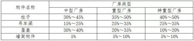 此外,還有一些次要的構件如工作平臺、梯子、門(mén)窗等。各種構件的用鋼量占整個(gè)廠(chǎng)房鋼結構的總用鋼量的比值大致如表所示。
