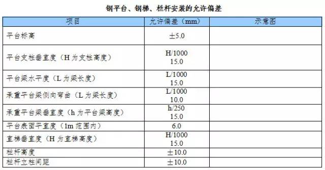 (3)欄桿安裝連接應牢固可靠,扶手轉角應光滑。(4)平臺、梯子和欄桿安裝的允許偏差應符合下表規定。