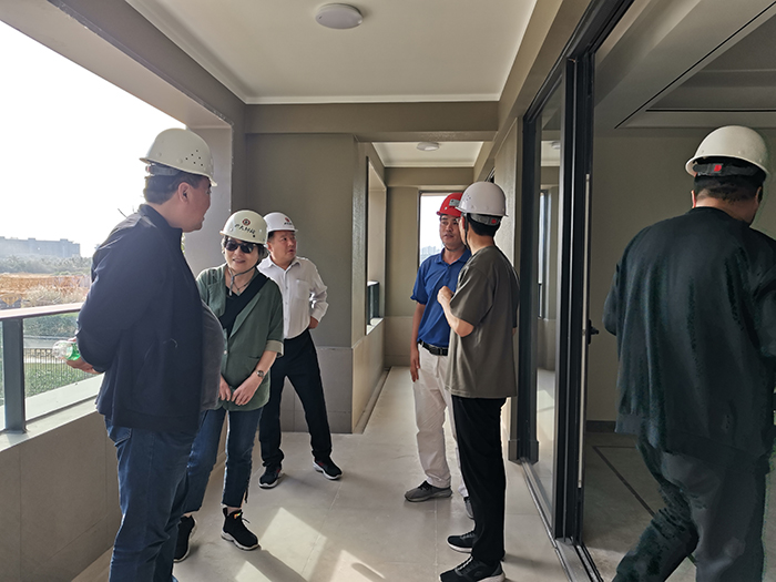 考察團先參觀(guān)了香樟苑項目的22#樓架空層、標準層及頂層,雙方就鋼結構鋼梁填充、裝配式內墻板與鋼柱交接、精裝修處理做法等節點(diǎn)進(jìn)行交流討論。香樟苑項目由19棟鋼結構裝配式住宅樓組成,已于2020年11月完成主體結構封頂,處于收尾階段,預計年底精裝交房。