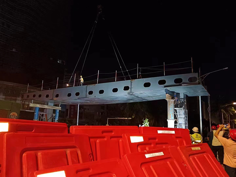 2023年6月20日23:00,在業(yè)主、總包、監理、設計等單位領(lǐng)導的共同見(jiàn)證下,由浙大鋼構承建的?趪Q路天橋項目首根鋼箱梁吊裝順利完成。